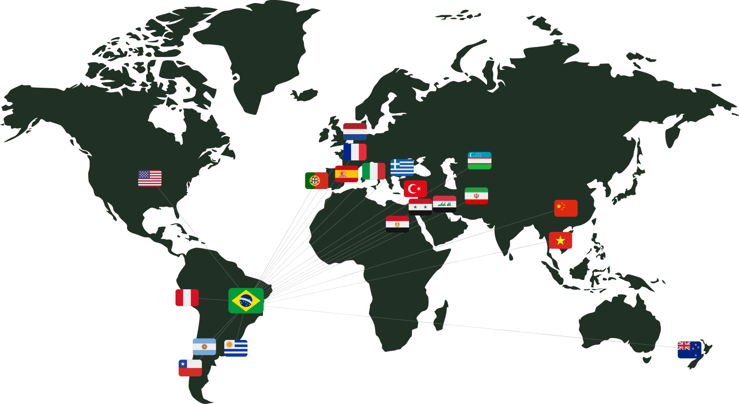 Representa a conexão da GOBRAZ com fornecedores confiáveis de diversos países — Brasil, Argentina, Chile, China, Egito, Espanha, EUA, França, Grécia, Itália, Holanda, Peru, Portugal, Turquia, Uruguai, Uzbequistão e Vietnã.